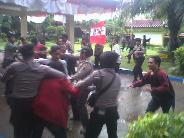 Namun karena tidak mendapat respon yang cukup baik, akhirnya puluhan mahasiswa secara paksa mendobrak pintu gerbang dan berujung bentrok dengan puluhan aparat dari Polres Bangkalan.