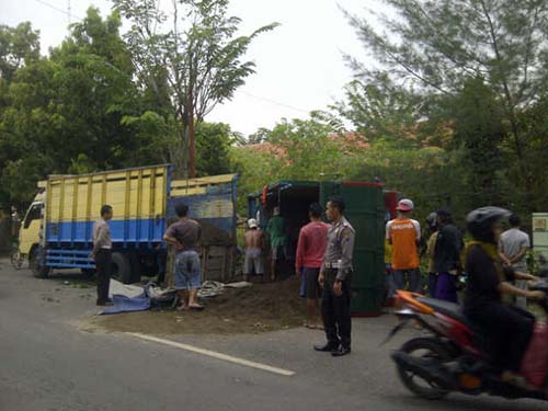 Sementara dari pantuan di lokasi, petugas kesulitan menarik posisi truk yang terguling. Selain menggunakan mobil derek, petugas juga meminta bantuan truk fuso untuk menarik truk yang terguling hingga nyungsep di pagar sekolah.(mar)