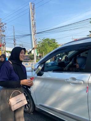 Tampak Komunitas yang mayoritas aktivitis perempuan ini, juga membawa benner, membagikan bunga mawar sebagai simbol cinta serta menyampaikan pesan perdamaian untuk dukungan Gus Muhaimin menjadi Presiden 2024, di Lampu merah Seninan dan Alun-alun Bangkalan pada acara car Free day. Minggu (2/7/2023).