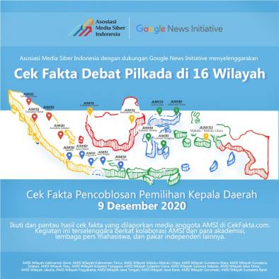 Jakarta, Asosiasi Media Siber Indonesia (AMSI) berkolaborasi dengan Tim Cek Fakta dengan dukungan Google News Initiative menyelenggarakan Cek Fakta Debat Pemilihan Kepala Daerah 2020. Kegiatan ini sebagai bentuk kontribusi AMSI kepada publik dengan memberikan informasi yang bermutu selama masa Pemilihan Kepala Daerah 2020 dan menekan hoaks (mis/disinformasi) yang berpotensi beredar selama berlangsungnya masa kampanye dan Debat Pilkada 2020 diberbagai daerah.