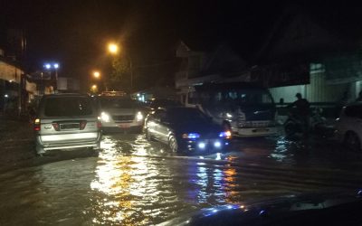 Ketinggian banjir sampai selutut, sekitar jam 21.00 Wib sudah mulai menyusut. Di sepanjang jalan banyak kendaraan kecil yang parkir menunggu kondisi jalan aman.