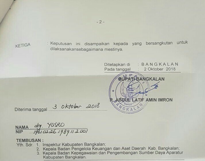 Apabila di kemudian hari terdapat kekeliruan dalam keputusan ini, akan diadakan perbaikan dan perhitungan kembali sebagaimana mestinya. SK ini telah diterima drg Yusro pada Rabu, 3 Oktober 2018.