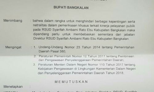 BANGKALAN, maduracorner.id- Surat Keputusan (SK) Bupati Bangkalan, tentang pembebasan sementara drg Yusro dari jabatan Direktur RSUD Bangkalan beredar luas melalui pesan aplikasi WhatsApp. SK nomor: 826/159/433.202/2018 itu, tertanggal 2 Oktober 2018.