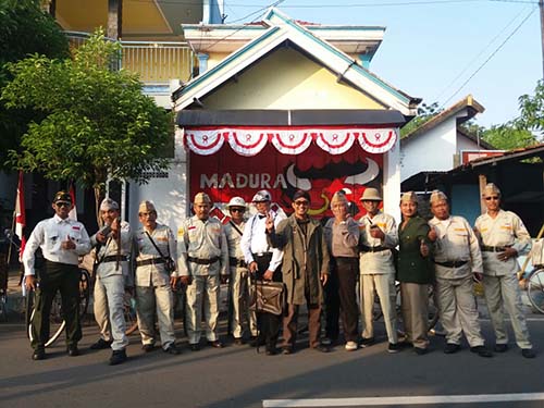 Bangkalan, maduracorner.id – Peringatan hari ulang tahun (HUT) kemerdekaan RI ke-71 bukan hanya milik pejabat. Tapi siapapun berhak merayakan hari keramat bagi bangsa Indonesia tersebut. Puluhan suporter K-Conk mania dan kompolan sepeda onthel Bangkalan tampak bersemangat dalam peringatan kemerdekaan ini. Penggemar sepeda onthel tampak gagah dengan memakai busana penjuang di tahun 1945 juga pistol di pinggang, memanggul senjata laras panjang lengkap dengan sepeda antik. Sedangkan para suporter K-Conk mania mengenakan atribut klub kebanggaan Madura United.Acara yang digelar di depan markas besar (Mabes) K-Conk mania jalan HOS Cokroaminoto no. 50 Bangkalan itu berjalan hikmat dan dipimpin langsung oleh Presiden K-Conk Mania, Jimhur Saros sebagai inspektur upacara.
