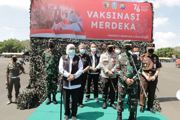 Seperti yang berlangsung hari ini, Senin (9/8/2021). Serbuan vaksinasi dosis kedua digelar di Makodam V/Brawijaya. Vaksinasi massal kali ini menyasar 20 ribu jiwa dan terbagi di beberapa titik lokasi. (Syaiful)