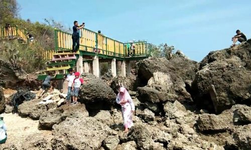 Warga mulai terus memadati wisata di ujung timur daya pamekasan ini, baik untuk berswafoto di jembatan warna warni yang menujuu pantai dan diatas batu karang meski terik matahari begitu panas.
