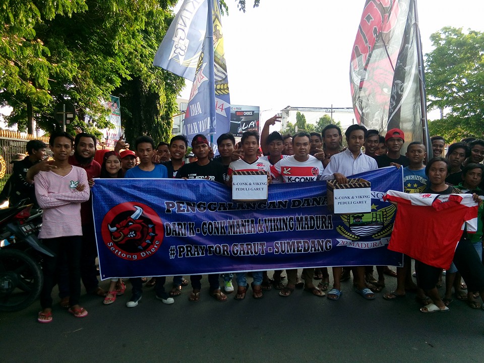 Bangkalan, maduracorner.id – Mabes K-Conk menggelar aksi penggalangan dana untuk korban bencana banjir Bandang yang terjadi di Jawa Barat. Tepatnya di Garut dan Sumedang. Tidak hanya K-Conk saja, kegiatan sosial ini juga dihadiri oleh Viking Madura, supporter Persib Bandung yang ada di wilayah Madura.Aksi penggalangan dana ini dilakukan di perempatan lampu merah alun-alun kota Bangkalan, selasa (27/9/2016) kemarin. Ratusan K-Conk dan Viking menyebar di beberapa ruas jalan sambil menenteng kardus minuman yang sudah diberi tulisan “K-Conk dan Viking Peduli Garut & Sumedang”.