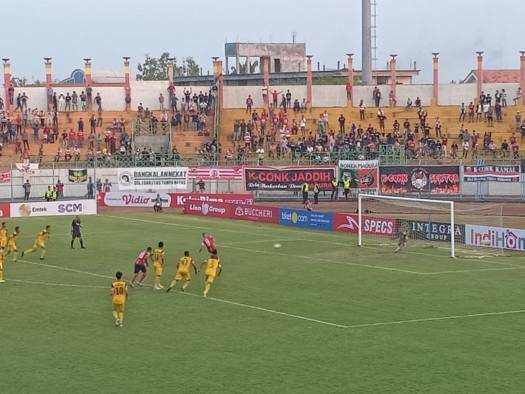 Namun naas pada menit 13 wasit menunjuk titik putih setelah bek Madura United melakukan pelanggaran di depan gawang yang di jaga Muhammad Ridho.