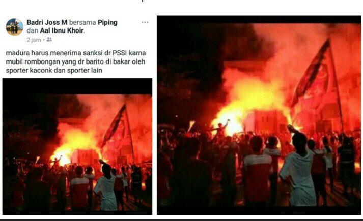 Dalam postingannya, pemilik akun memberi catatan atas foto suporter yang membakar cerawat dengan kalimat “Madura harus menerima sanksi dari PSSI karena mobil rombongan yang dari Barito dibakar oleh suporter K Conk dan suporter lain”.