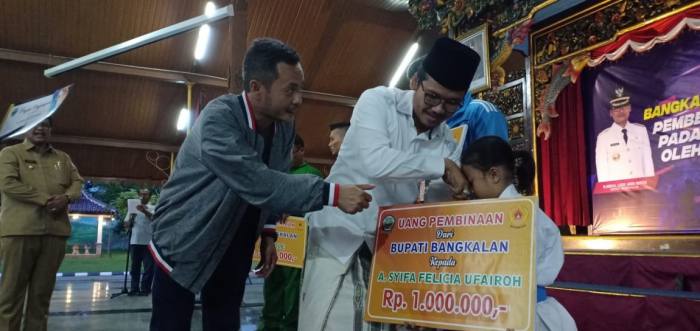 Atas keberhasilannya dalam olimpiade tersebut siswa kelas 2 siswa SMP Sabilus Sholihin Pedeng Socah Bangkalan ini mendapat penghargaan medali emas dan trofi.