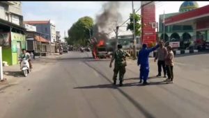 Petugas dari Koramil dan Polsek Kamal saat berupaya melakukan pemadaman kobaran api yang hanguskan mobil Pick Up depan SPBU Kamal.