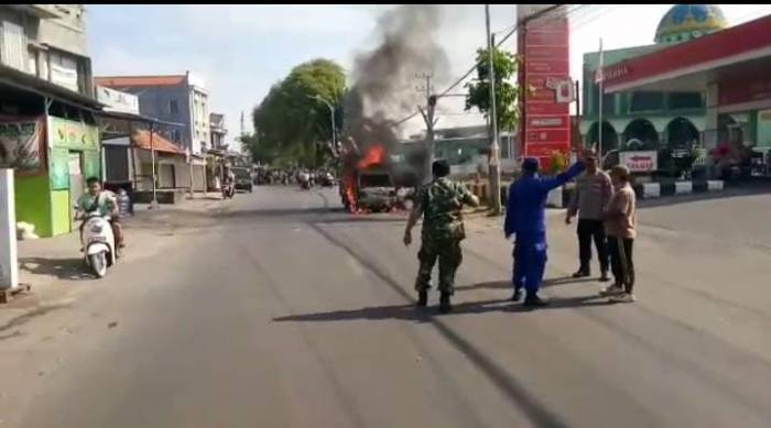 Petugas dari Koramil dan Polsek Kamal saat berupaya melakukan pemadaman kobaran api yang hanguskan mobil Pick Up depan SPBU Kamal.