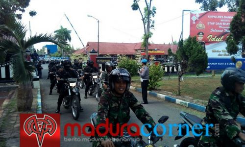 BANGKALAN, maduracorner.id- Polres Bangkalan, menggelar patroli gabungan bersama Kodim 0829/Bangkalan, TNI AL Batuporon, Dishub dan Satpol PP. Pasukan gabungan yang dikerahkan dalam patroli skala besar tersebut, mencapai 310 personil.