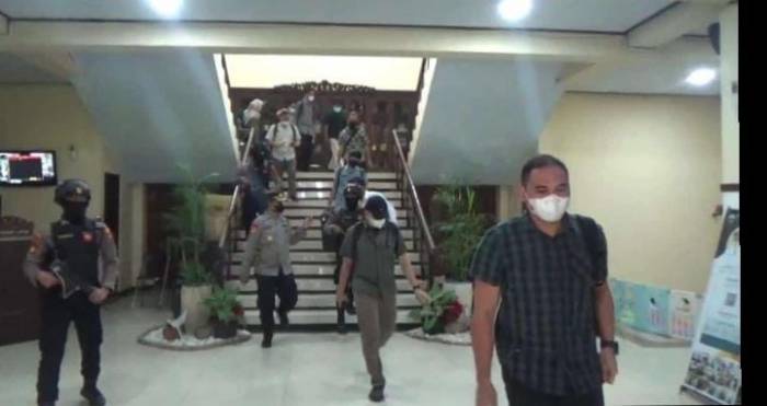 Penyidik yang dikawal anggota kepolisian bersenjata lengkap tampak turut melakukan penjagaan atas penggeledahan ini.