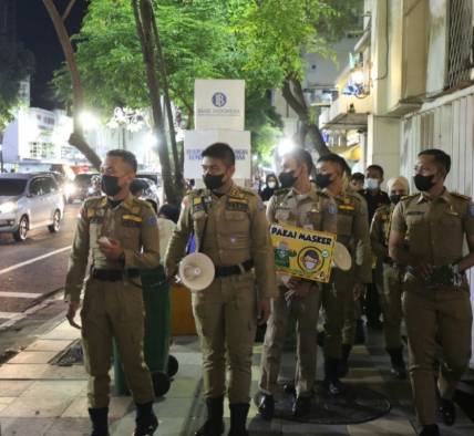 Para Praja IPDN saat melakukan sosialisasi prokes didampingi BPB Linmas Kota Surabaya. Ketika sosialisasi, para Praja IPDN tersebut dibagi dua kelompok di sisi barat dan timur pedestrian Jalan Tunjungan.