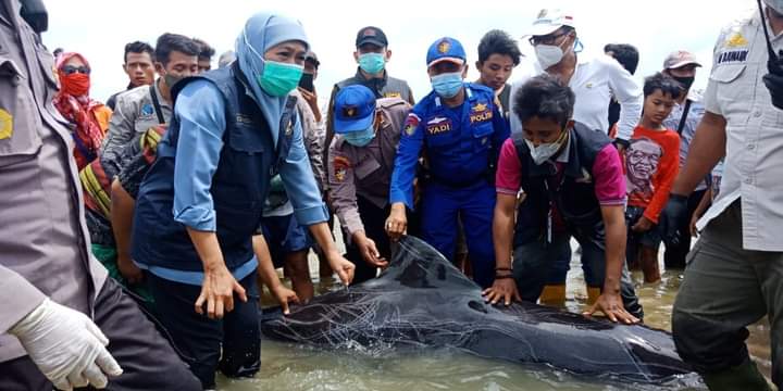 “Ikan paus yang mati nantinya dilakukan penelitian oleh Fakultas Kedokteran Hewan Unair, ujar Khofifah di lokasi. Jumat (19/2/2021).