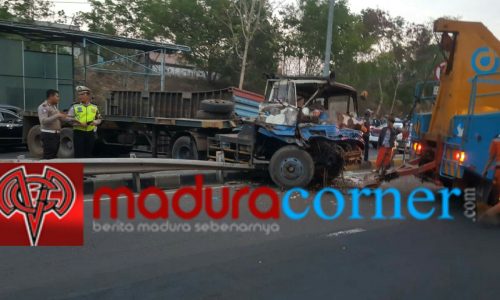 BANGKALAN, maduracorner.id-Tabrakan beruntun terjadi di pintu masuk Jembatan Suramadu, Kamis (18/10/2018). Kendaraan Trailer roda enam dengan nomor polisi (nopol) L 8765 UV tiba-tiba menghantam truk boks yang tengah bertransaksi di loket jembatan.