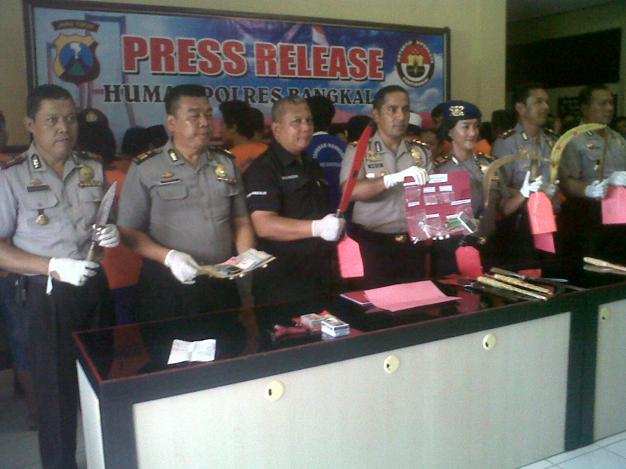 Sementara itu, senjata tradisonal jenis sken sebanyak 6 buah, pisau 5 buah, celurit 4 buah, 2 buah kunci T, 2 unit HP, kartu remi, 1 buah alat pengisap sabu (bong). Narkoba jenis sabu-sabu seberat 0,62 gram, pipet, korek api 1 buah, 3 unit sepeda motor, 1 unit alat main togel hongkong dan uang tunai sebanyak Rp.1.837. 000 disita sebagai barang bukti (BB).