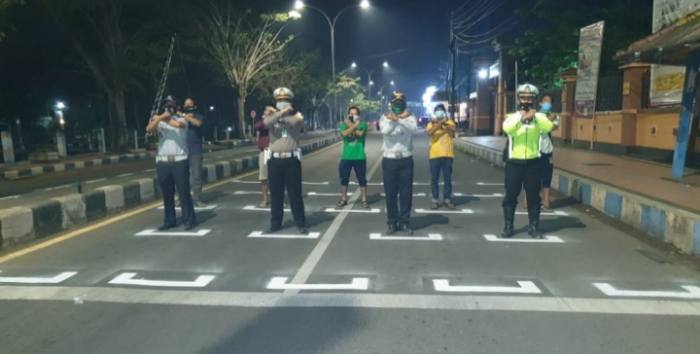 Salah satunya dengan membuat marka jalan physical distancing di simpang tiga Jl. Halim Perdana Kusuma, Kabupaten Bangkalan.