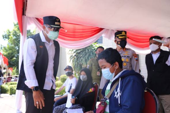 Usai meninjau pelaksanaan vaksinasi massal di Lapangan Thor, Wali Kota Eri beserta rombongan langsung tancap gas menuju lokasi vaksinasi massal untuk pelajar SMP yang diselenggarakan di Islamic Center Surabaya. Setibanya di lokasi, Wali Kota Eri beserta rombongan menyempatkan diri untuk menyapa dan bercengkrama serta memberikan semangat kepada pelajar yang sedang menunggu giliran divaksin. (Syaiful)