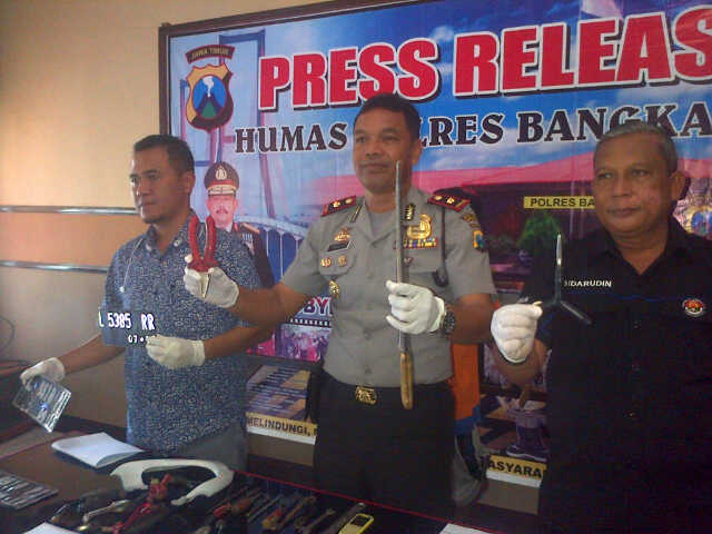 Beberapa peralatan yang digunakan untuk kejahatan oleh tersangka . Seperti 1 buah pisau penghabisan, 7 buah obeng, 1 buah spion, 1 buah alat pembuka busi, 1 buah kunci inggris, 1unit pegangan tang belakang 1 buah pembukaan kunci busi, 4 buah kunci pas, 2 buah tank, kunci busi, 1 buah pegangan spion, 1 unit HP, 1 buah kunci T, plat nomer sepeda moyor. M 5385 RR, L 6519 PI, L 6519 PI dan 1 unit sepeda notor, Yamah Mio yang diduga hasil curas dan tanpa plat nopol tersebut disita sebagai barang bukti kejahatannya.