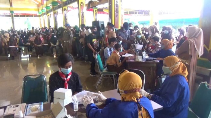 Peserta vaksinasi ini diikuti ratusan pelajar di Kabupaten Bangkalan. Mereka menyodorkan KTP dan antrian kepada petugas yang menangani vaksinasi. Ironisnya, mereka tak beranjak dari kerumunan tersebut.