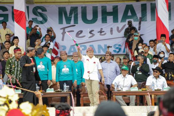 Caption: Ketua Umum DPP PKB Drs. Muhaimin Iskandar menyapa masyarakat Bangkalan dalam acara festival kerapan sapi Gus Muhaimin.