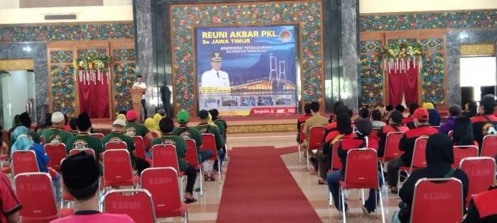 Bangkalan, maduracorner.id, Ratusan Pedagang Kaki Lima (PKL) lintas Jawa-Madura merajut kebersamaan dengan menggelar Reuni Akbar di Gedung Rato Kabupaten Bangkalan, Madura, Selasa, (01/03/22).