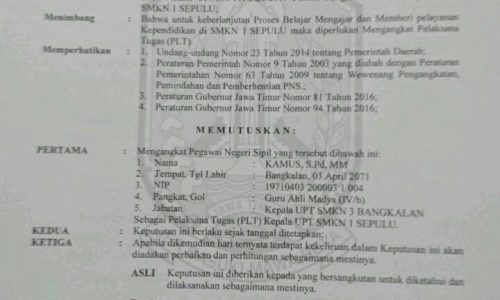 BANGKALAN, maduracorner.id – setelah dua kali didemo oleh siswanya sendiri, kepala SMKN 1 Sepulu akhirnya mengundurkan diri. Tercatat, sejak hari jumat 24/11 lalu. Penggantinya, Kamus selaku kepala SMAN 3 Bangkalan yang statusnya sebagai PLT.