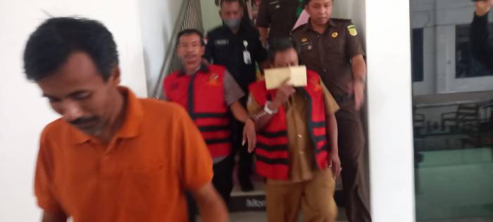 Tersangka Dana Desa MR dan AA saat digiring keluar dari ruang pemeriksaan Kejari Bangkalan.
