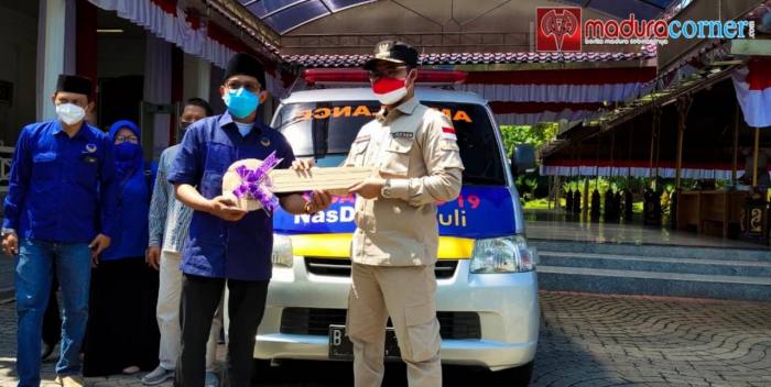 Salah satunya, satu unit mobil ambulan yang direalisasikan itu sebagai bentuk pedulinya partai NasDem untuk memfasilitasi penanganan covid-19 di kabupaten Bangkalan yang akan di tempatkan di compok sehat di Pondok Pesantren An-Nafi’iyah, Desa Kampak, Kecamatan Geger, Kabupaten Bangkalan, Madura.